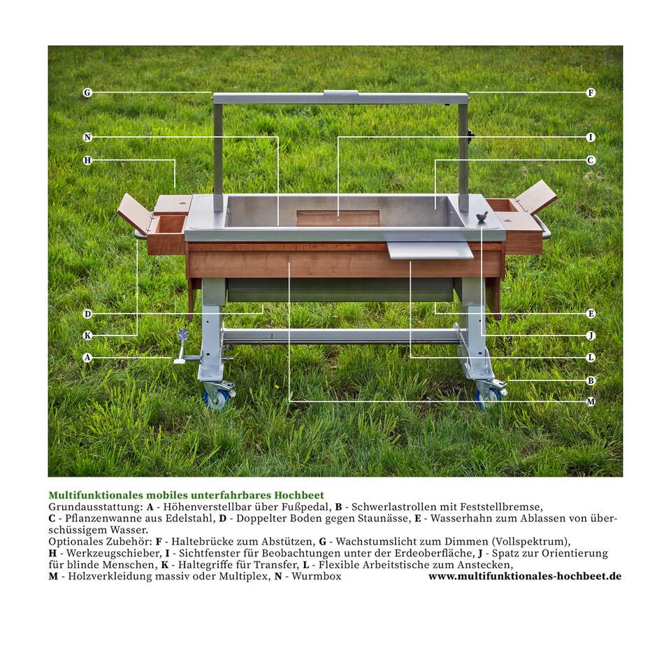 Aus den Erkenntnissen und den rechtlichen bzw. regulatorischen Vorgaben wurde ein multifunktionales barrierefreies Hochbeet Modell MH1 konstruiert, das sich an die Bedürfnisse der verschiedenen Personengruppen anpasst. Es ermöglicht den Zugang zu gärtnerischen Tätigkeiten und naturnahen Erfahrungen in einem eigenen kleinen Garten.