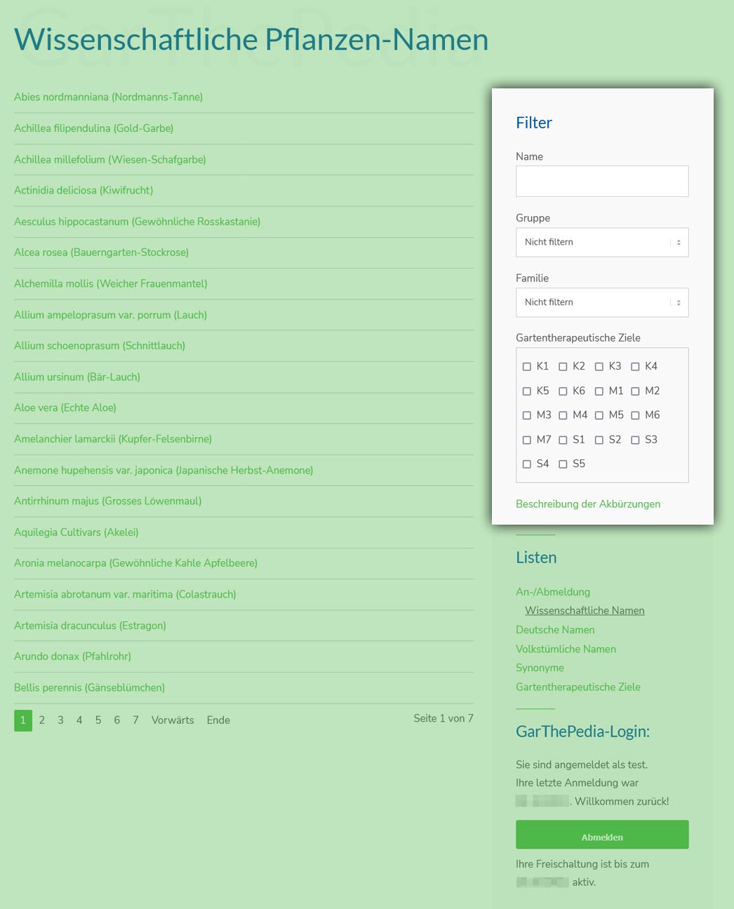 Ebenfalls auf der rechten Seite lassen sich verschiedene Listen öffnen. Darin sind wissenschaftliche Namen, deutsche Namen, volkstümliche Namen, Synonyme und gartentherapeutische Ziele alphabetisch sortiert.