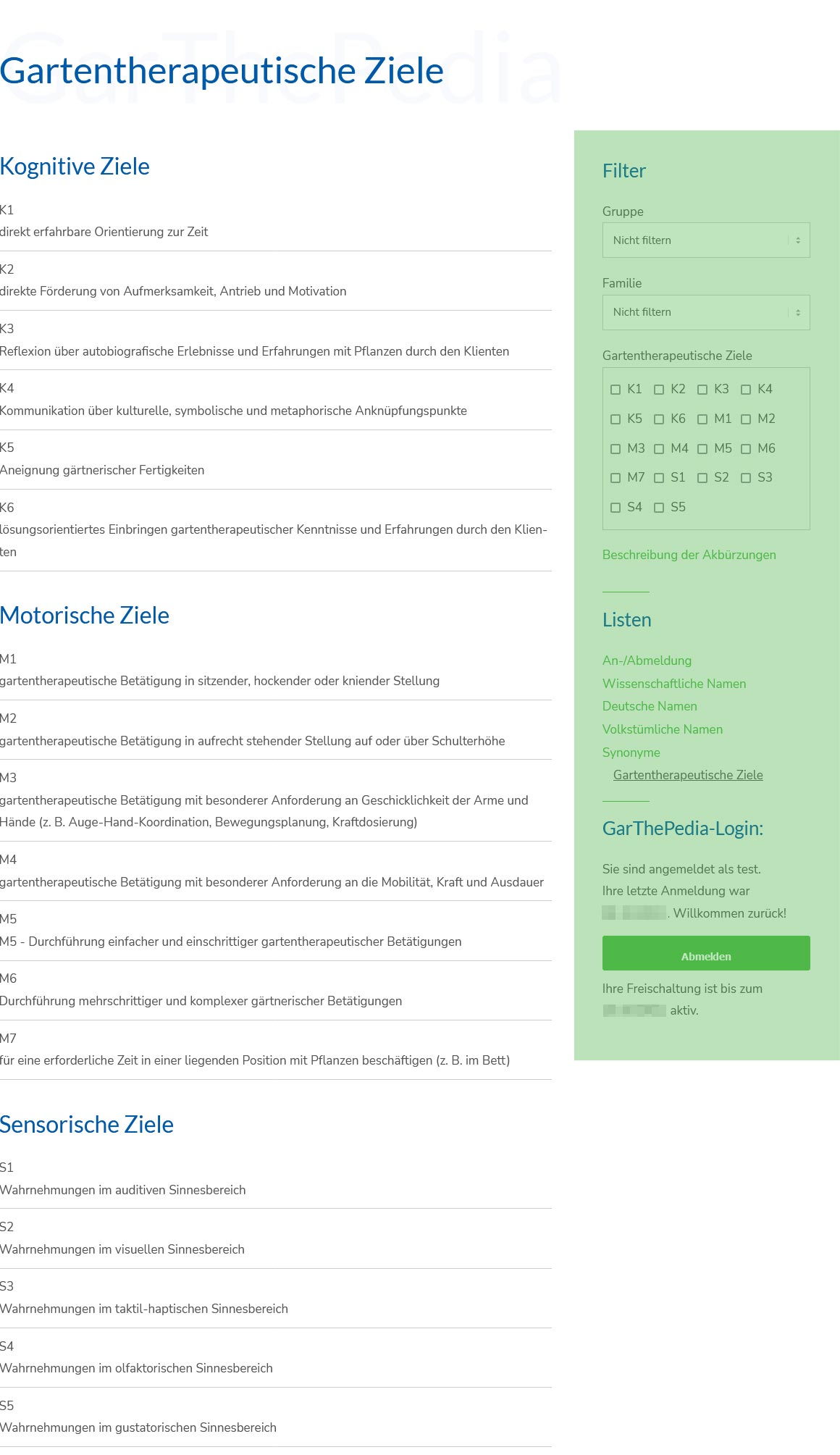 Eine Übersicht kann man sich unter dem Filter auf der rechten Seite verschaffen. Hier gelangt man schnell zu gartentherapeutischen Zielen, Gruppen oder Familien.